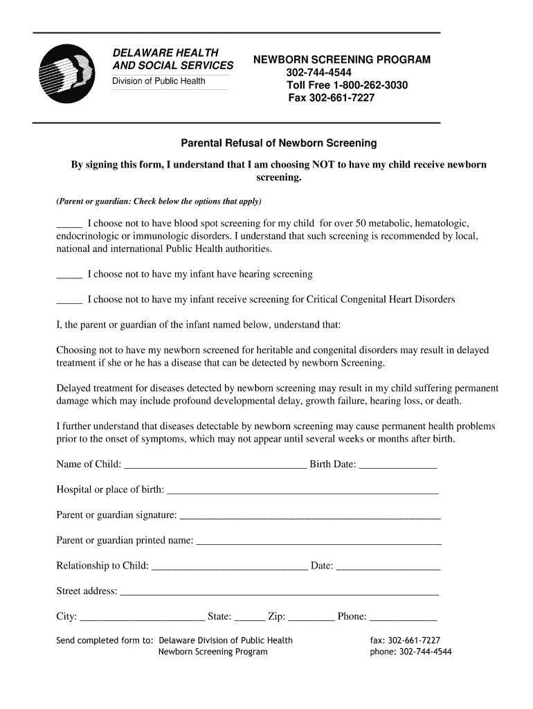 DELAWARE HEALTH AND SOCIAL SERVICES Division of Public Health NEWBORN SCREENING PROGRAM 3027444544 Toll Free 18002623030 Fax 3026617227Parental Refusal of Newborn Screening By signing this form, I
