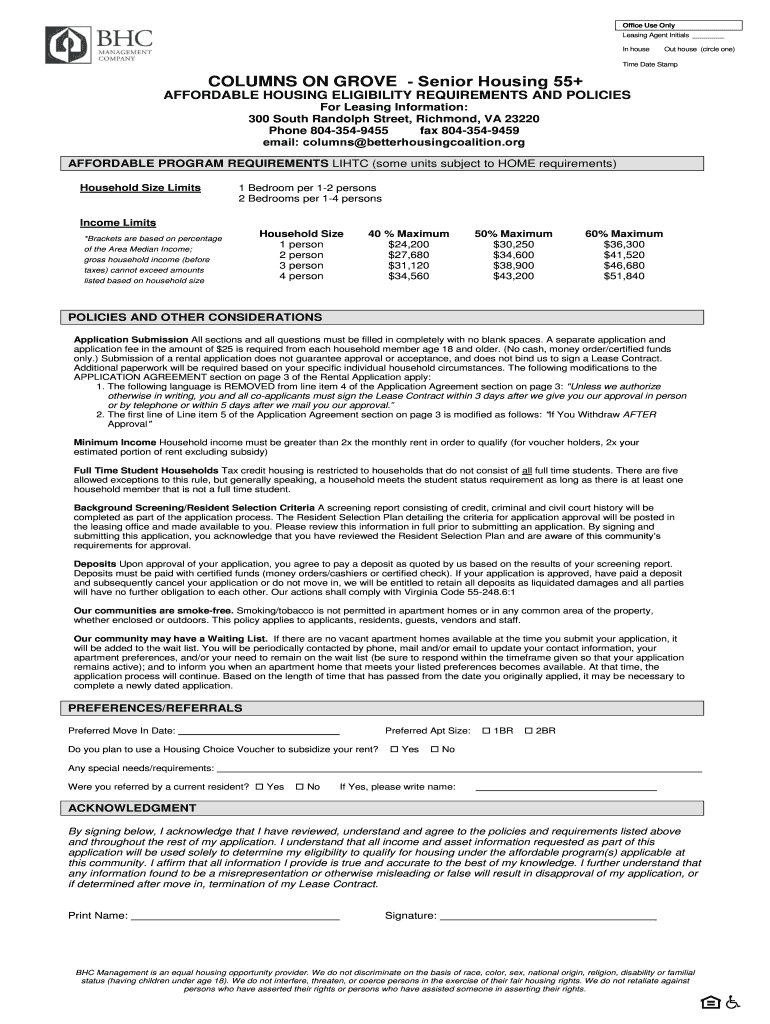 Office Use Only Leasing Agent Initials In houseboat house (circle one)Time Date StampCOLUMNS ON GROVE Senior Housing 55+AFFORDABLE HOUSING ELIGIBILITY REQUIREMENTS AND POLICIES For Leasing Information: