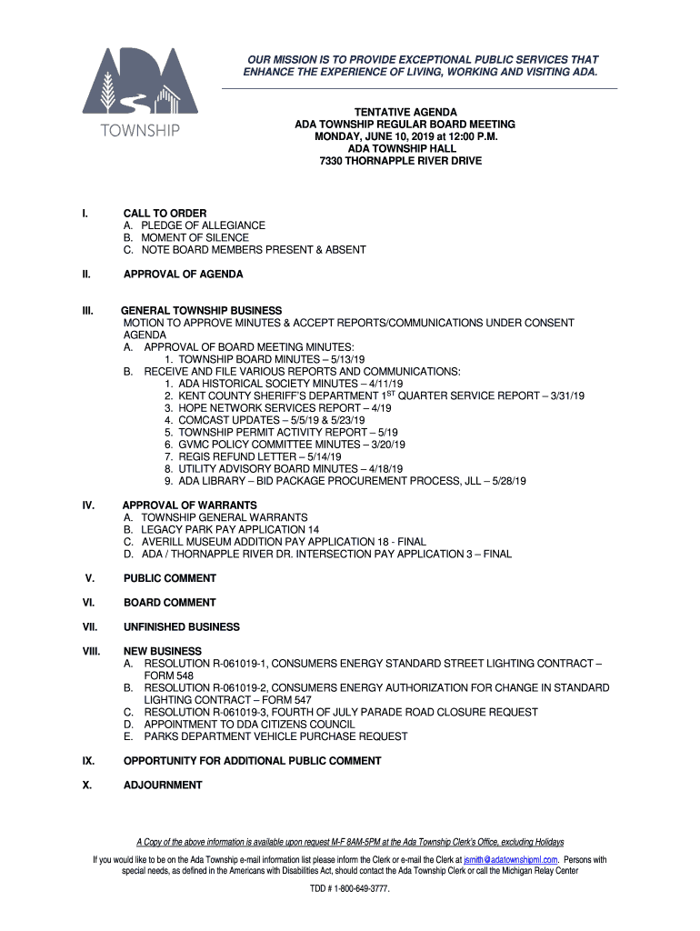 OUR MISSION IS TO PROVIDE EXCEPTIONAL PUBLIC SERVICES THAT ENHANCE THE EXPERIENCE OF LIVING, WORKING AND VISITING ADA. TENTATIVE AGENDA ADA TOWNSHIP REGULAR BOARD MEETING MONDAY, JUNE 10, 2019, at