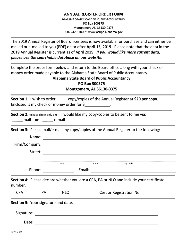 ANNUAL REGISTER ORDER FORMALABAMA STATE BOARD OF PUBLIC ACCOUNTANCY PO Box 300375 Montgomery AL 361300375 3342425700 www.asbpa.alabama.govThe 2019 Annual Register of Board licensees is now available