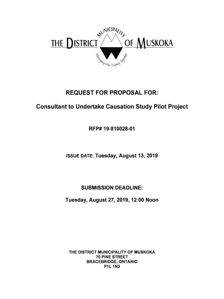 REQUEST FOR PROPOSAL FOR: Consultant to Undertake Causation Study Pilot Project RFP# 1981002801ISSUE DATE: Tuesday, August 13, 2019SUBMISSION DEADLINE: Tuesday, August 27, 2019, 12:00 Soothe DISTRICT