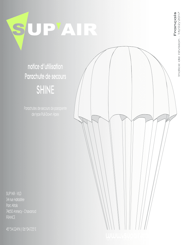 SHINE Parachutes DE scours DE parapet DE type Spelldown ApexSUPAIR OLD 34 rue Aerate PARC Alta's 74650 Annecy Havana FRANCE 4554.024 N / 0604.725EIndice de vision : 14/02/2017Franaisnotice utilization