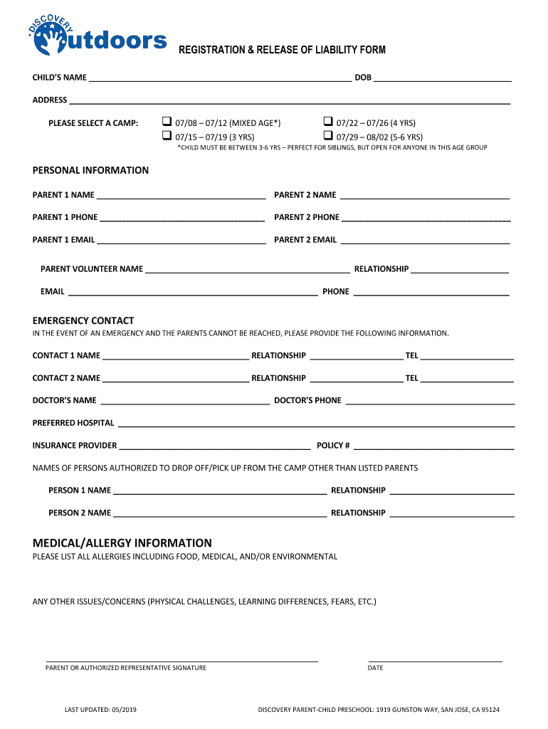 REGISTRATION & RELEASE OF LIABILITY FORM CHILD NAME DOB ADDRESS PLEASE SELECT A CAMP:q 07/08 07/12 (MIXED AGE*) q 07/15 07/19 (3 YRS)q 07/22 07/26 (4 YRS) q 07/29 08/02 (56 YRS)*CHILD MUST BE BETWEEN