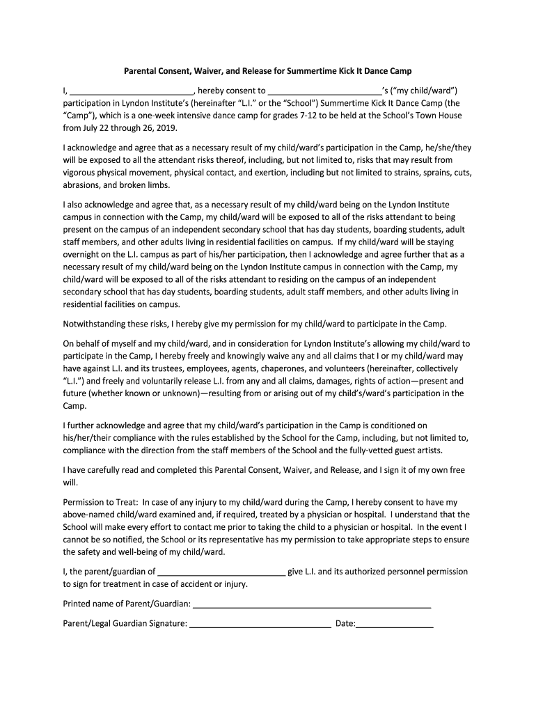 Get the free 2019 Summertime Kick It Dance Camp Release Form.docx