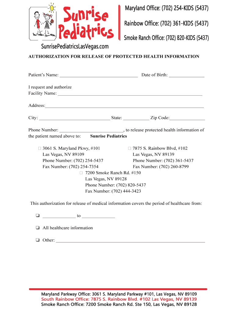 AUTHORIZATION FOR RELEASE OF PROTECTED HEALTH INFORMATIONPatients Name: Date of Birth: I request and authorize Facility Name: Address: City: State: Zip Code: Phone Number:, to release protected health