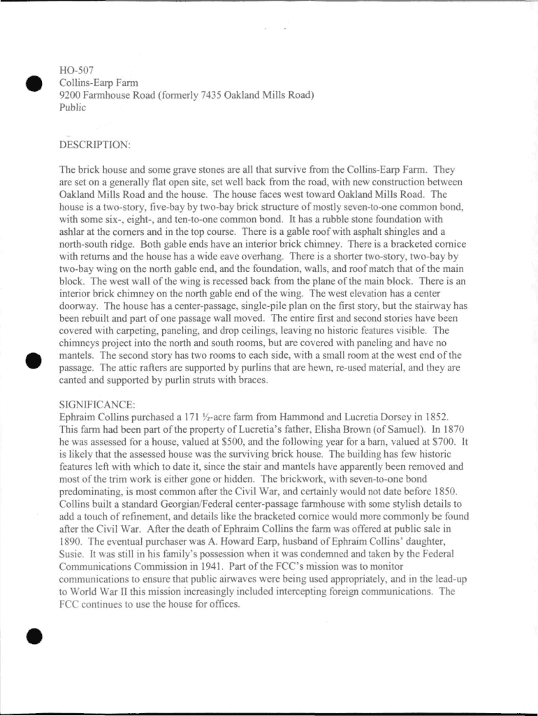 Get the free HO-507 Collins-Earp Farm 9200 Farmhouse Road (formerly ... - mht maryland