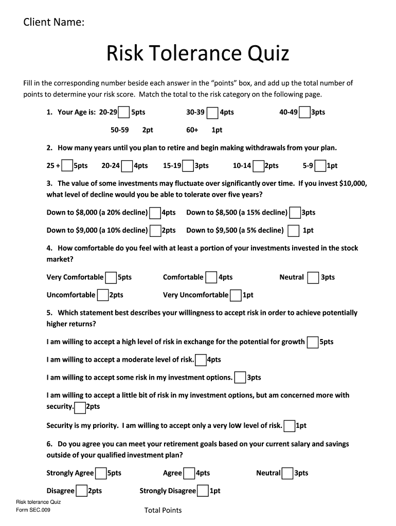 Clientele: RiskToleranceQuiz Fillinthecorrespondingnumberbesideeachanswerinthepointsbox, andaddupthetotalnumberof pointstodetermineyourriskscore. Matchthetotaltotheriskcategoryonthefollowingpage.