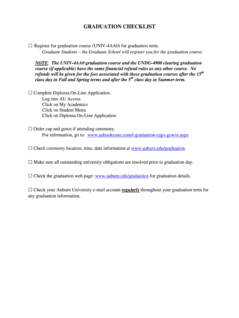 GRADUATION CHECKLIST Register for graduation course (UNIV4AA0) for graduation term. Graduate Students the Graduate School will register you for the graduation course. NOTE: The UNIV4AA0 graduation