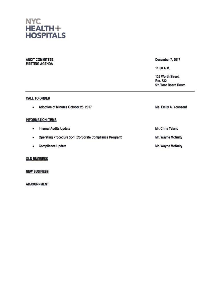 AUDIT COMMITTEE MEETING AGENDA December 7, 2017 11:00 A.M. 125 Worth Street, Rm. 532 5th Floor Board Robocall TO ORDER Adoption of Minutes October 25, 2017Ms. Emily A. YoussoufINFORMATION ITEMS Internal