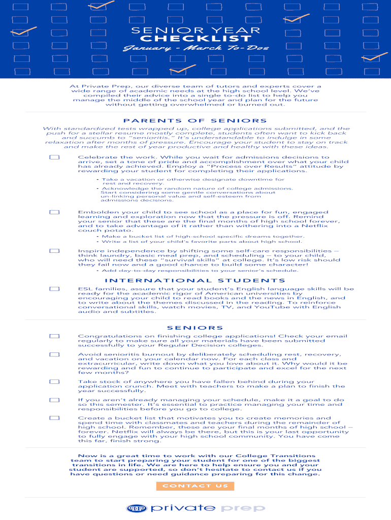 SENIOR YEAR CHECKLIST January March Today Private Prep, our diverse team of tutors and experts cover a wide range of academic needs at the high school level. We've compiled their advice into a single
