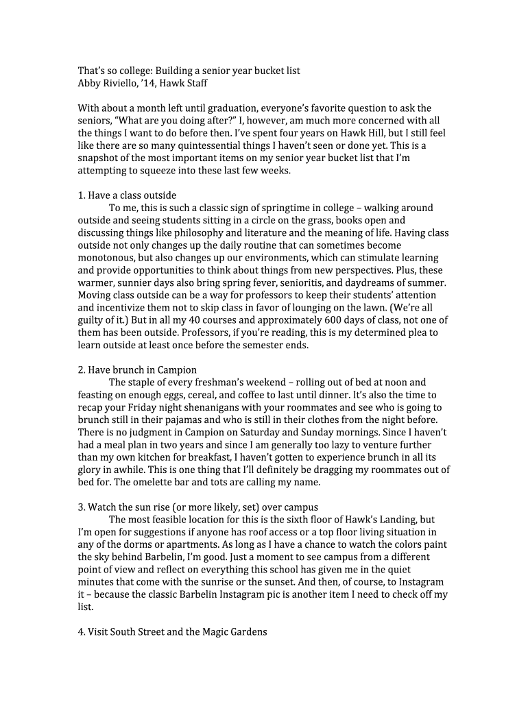 That's so college: Building×a senior×year×bucket×list Abby×Riviera, ×14, Hawk×Staffing×about×a month×left×until×graduation, everyone's favorite×question×to ask×the seniors, ×What×are×you×doing×after? I,