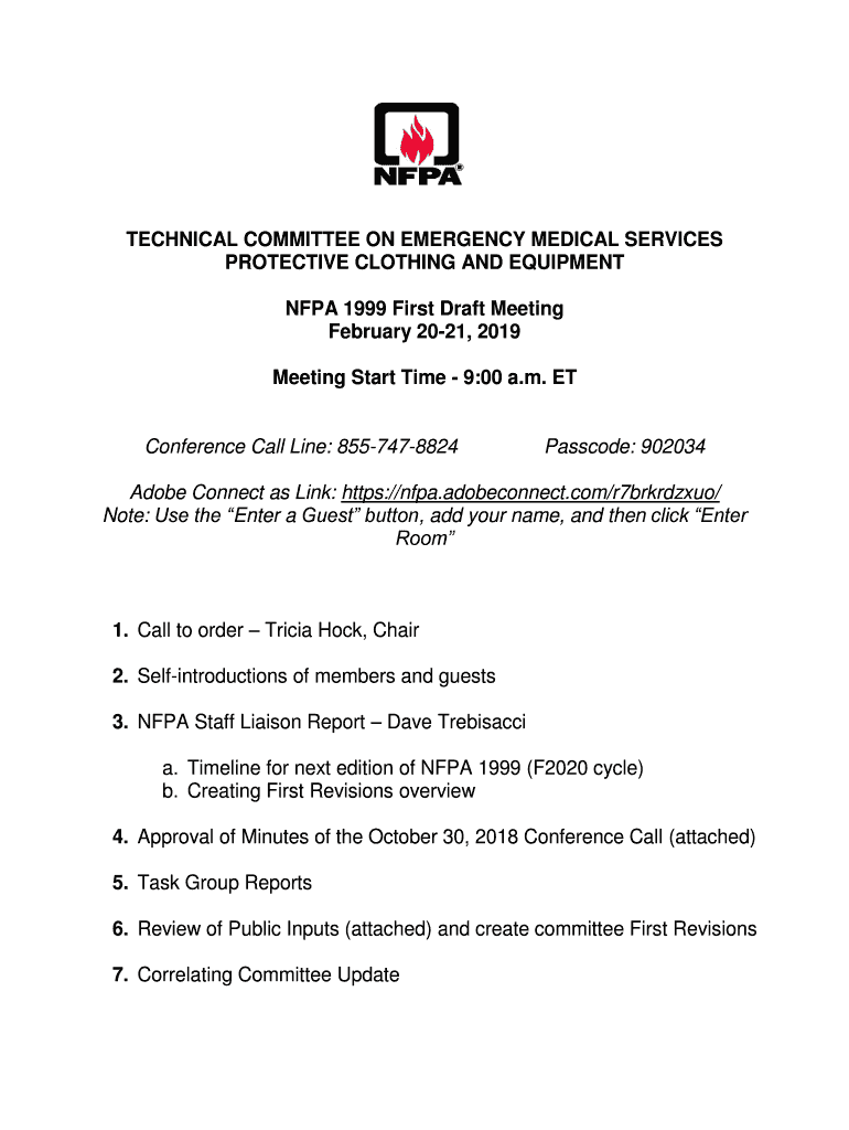 TECHNICAL COMMITTEE ON EMERGENCY MEDICAL SERVICES PROTECTIVE CLOTHING AND EQUIPMENT NFPA 1999 First Draft Meeting February 2021, 2019 Meeting Start Time 9:00 a.m. Conference Call Line: 8557478824Passcode: