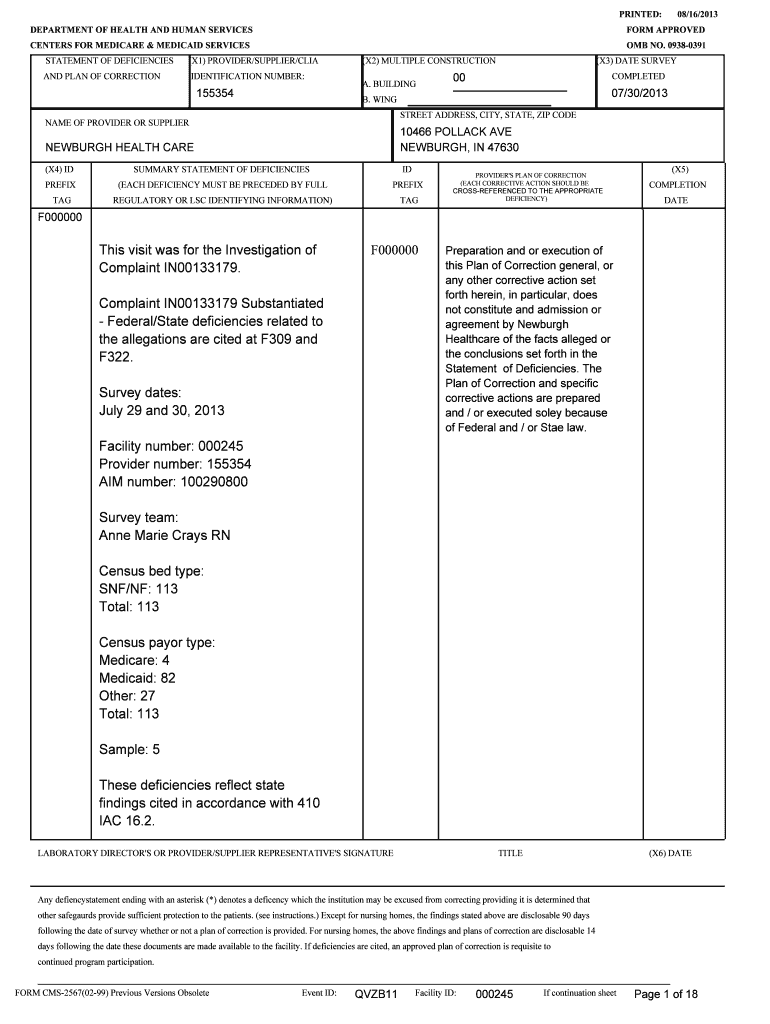 PRINTED: DEPARTMENT OF HEALTH AND HUMAN SERVICES CENTERS FOR MEDICARE & MEDICAID SERVICES STATEMENT OF DEFICIENCIES(X1) PROVIDER/SUPPLIER/LIGAND PLAN OF CORRECTIONIDENTIFICATION NUMBER:15535408/16/2013FORM