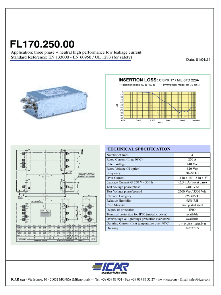 FL170.250.00 Application: three-phase + neutral high performance low leakage current Standard Reference: EN 133000 EN 60950 / UL 1283 (for safety)Date: 01/04/24INSERTION LOSS: CISP 17 / MIL STD 220AdB