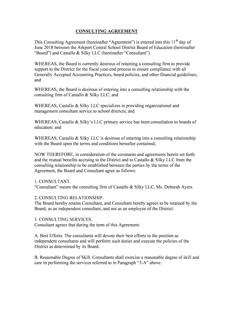 CONSULTING AGREEMENT This Consulting Agreement (hereinafter Agreement) is entered into this 11th day of June 2018 between the Ark port Central School District Board of Education (hereinafter Board)
