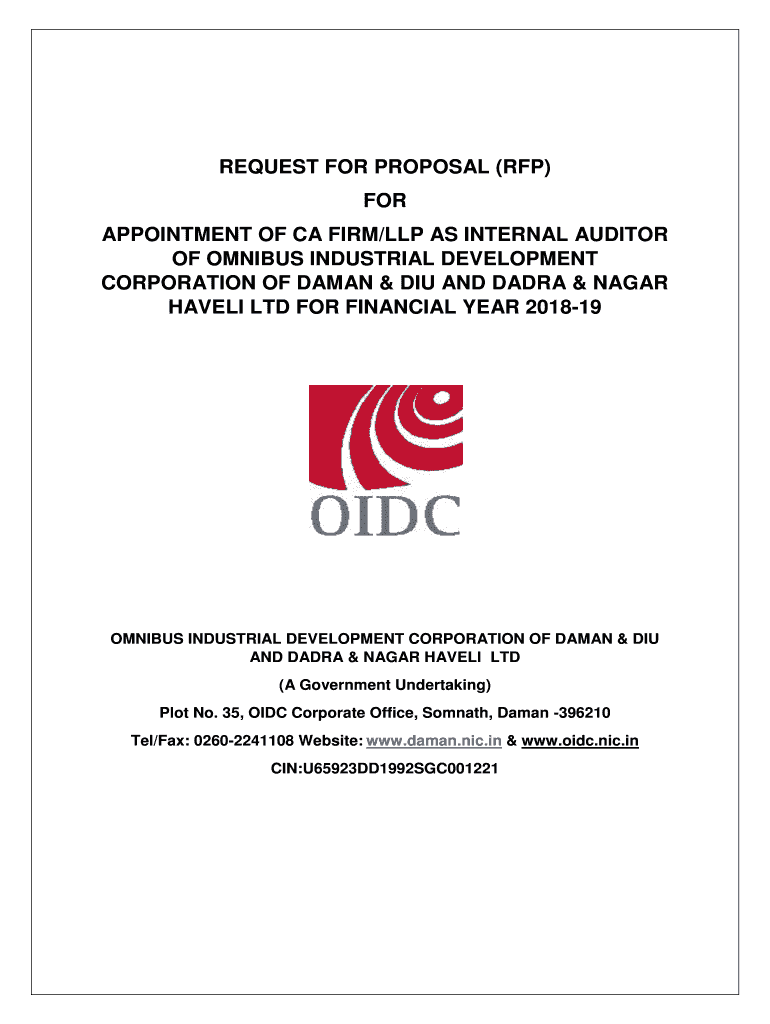 REQUEST FOR PROPOSAL (RFP) FOR APPOINTMENT OF CA FIRM/LLP AS INTERNAL AUDITOR OF OMNIBUS INDUSTRIAL DEVELOPMENT CORPORATION OF DAMON & DID AND DADA & NAGAR HAVEL LTD FOR FINANCIAL YEAR 201819OMNIBUS