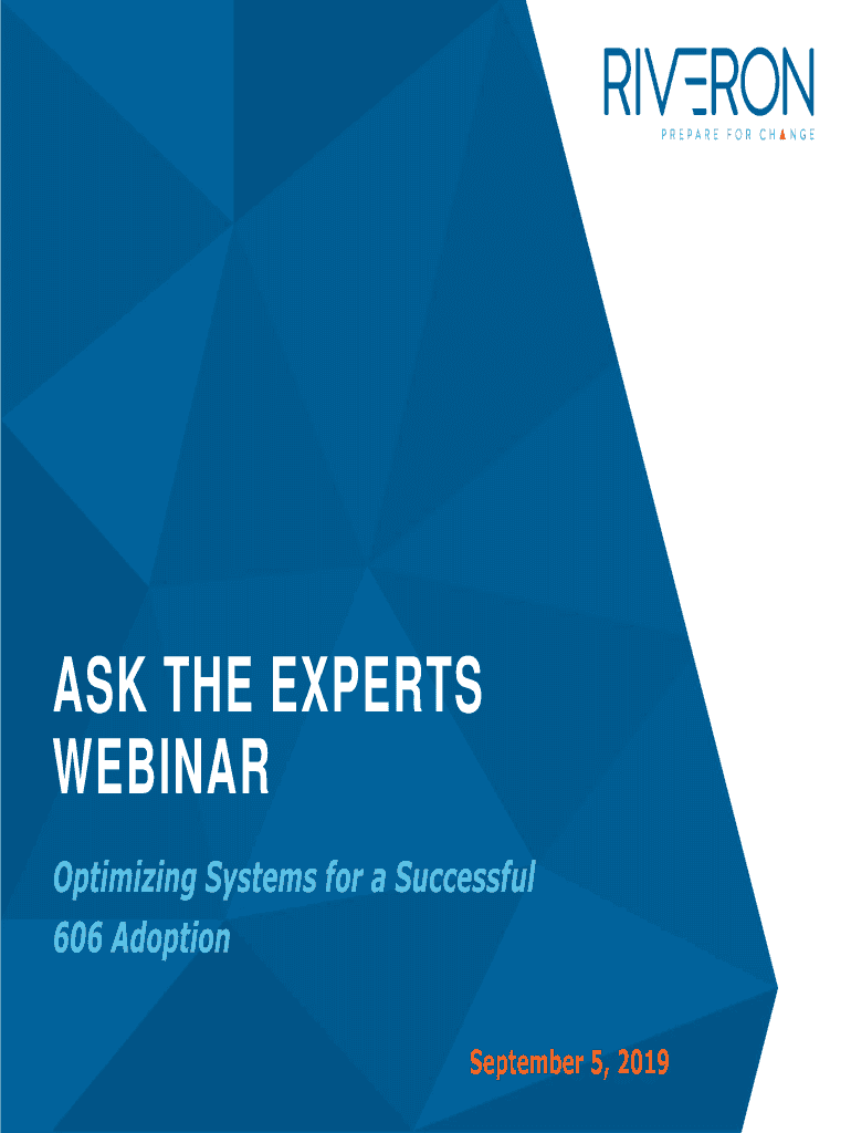 ASK THE EXPERTS WEBINAR Optimizing Systems for a Successful 606 Adoption September 5, 2019KEY REMINDERS River on webcasts past and upcoming 4 polling questions must be answered to obtain Chef you