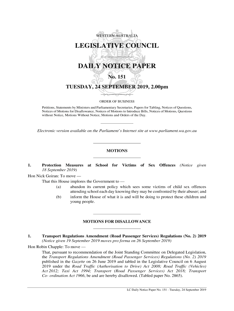 Get the free Notice Paper No 151 - Parliament of Western Australia