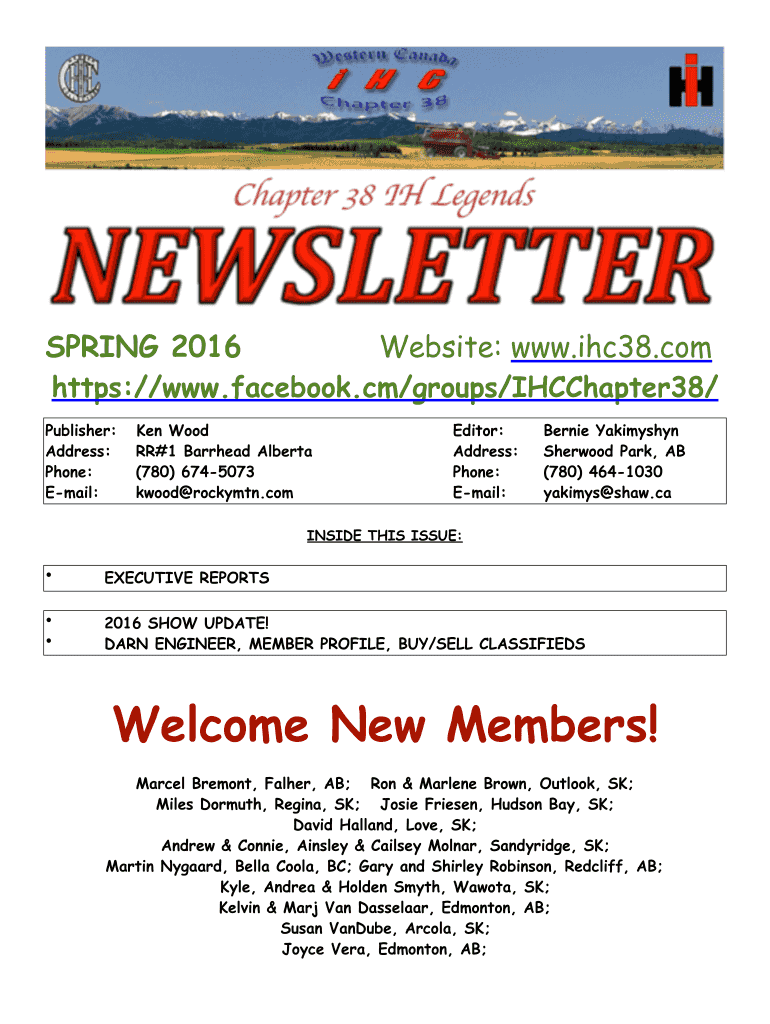 SPRING 2016 Website: www.ihc38.com https://www.facebook.cm/groups/IHCChapter38/ Publisher: Address: Phone: Email:Ken Wood RR×1 Barr head Alberta (780) 6745073 wood rocket.competitor: Address: Phone: