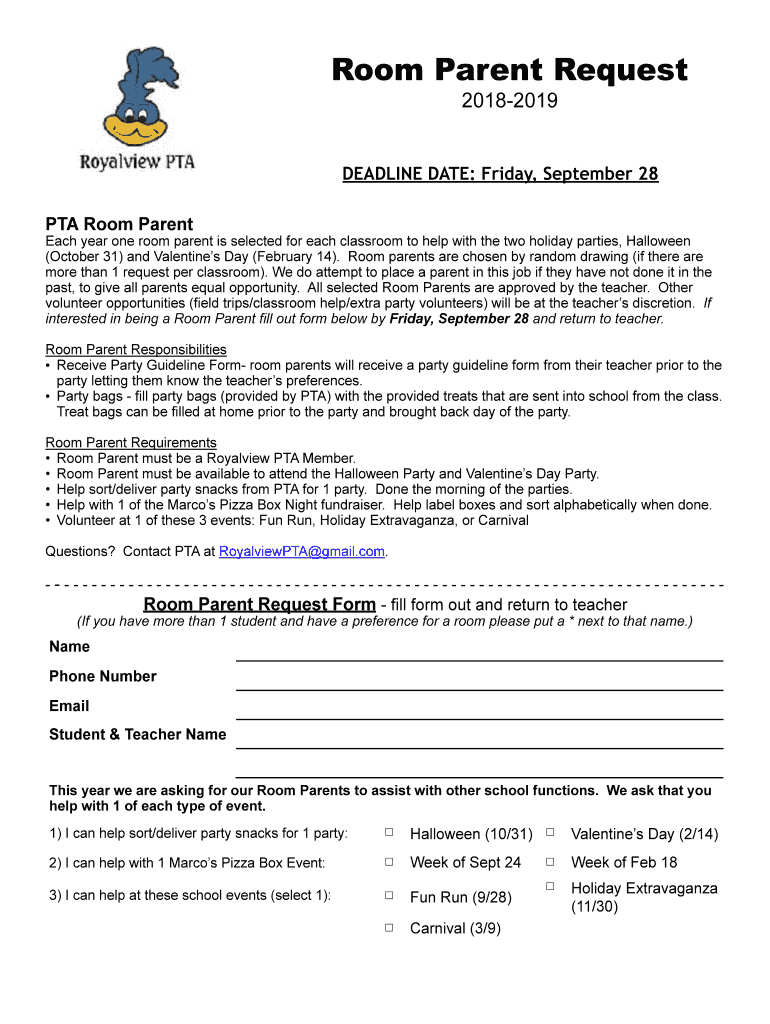 PTA Room Parental year one room parent is selected for each classroom to help with the two holiday parties, Halloween