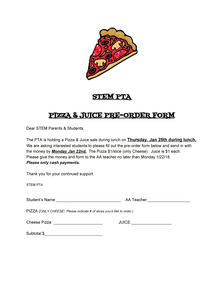 STEM PTA PIZZA & JUICE PREORDER FORM Dear STEM Parents & Students, The PTA is holding a Pizza & Juice sale during lunch on Thursday, Jan 25th during lunch. We are asking interested students to please