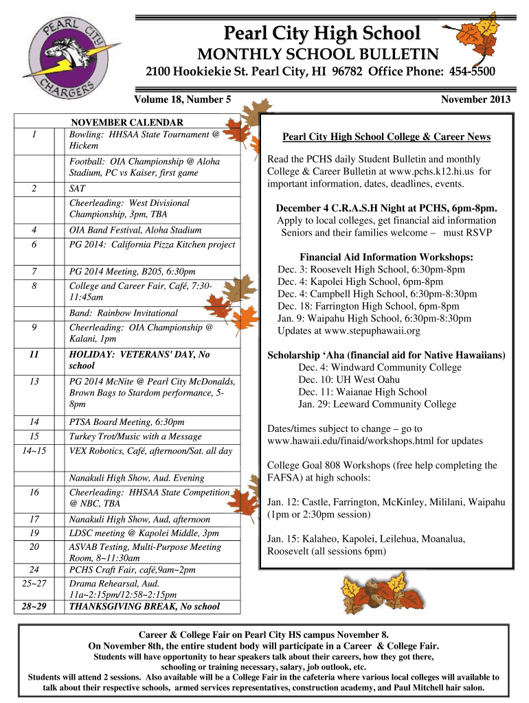 Pearl City High SchoolMONTHLY SCHOOL BULLETIN 2100 PewDiePie St. Pearl City, HI 96782 Office Phone: 4545500 Volume 18, Number 5 124 6 7 89NOVEMBER CALENDAR Bowling: HHS AA State Tournament HickemPearl
