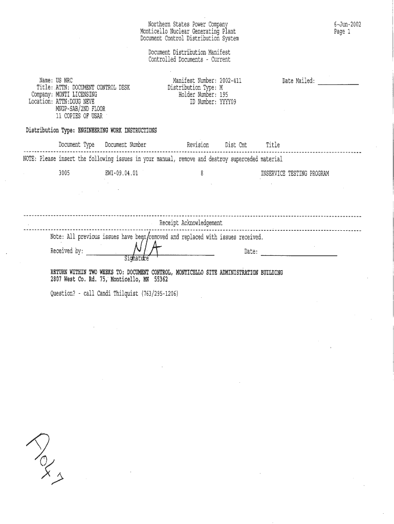 Northern States Power Company Monticello Nuclear Generating Plant Document Control Distribution System6Jun2002 Page 1Document Distribution Manifest Controlled Documents Current Name: Title: Company: