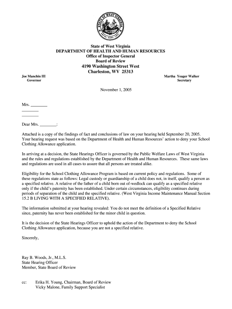 State of West Virginia DEPARTMENT OF HEALTH AND HUMAN RESOURCES Office of Inspector General Board of Review4190 Washington Street West Charleston, WV 25313 Joe Man chin III Governor Martha Yeager