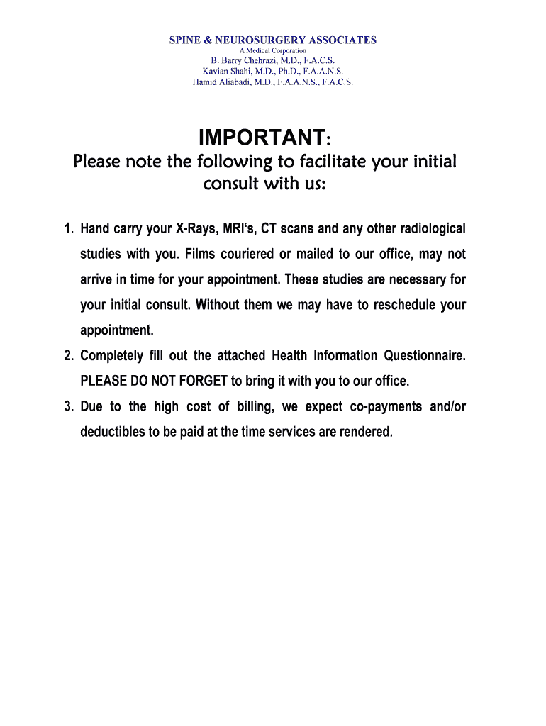 SPINE & NEUROSURGERY ASSOCIATES A Medical Corporation. Barry Cheri, M.D., F.A.C.S. Avian Shah, M.D., Ph.D., F.A.A.N.S. Hamid Alabama, M.D., F.A.A.N.S., F.A.C.S.IMPORTANT:Please note the following