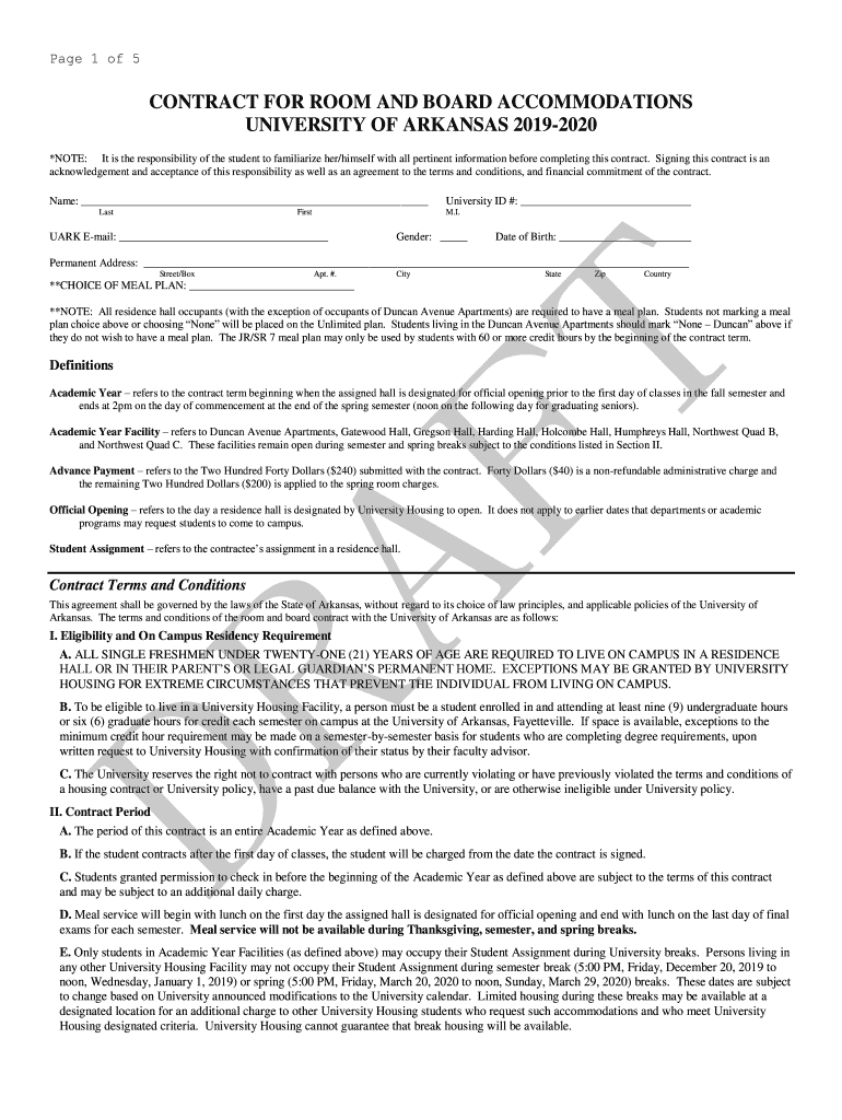 Page 1 of 5CONTRACT FOR ROOM AND BOARD ACCOMMODATIONS UNIVERSITY OF ARKANSAS 20192020 *NOTE: It is the responsibility of the student to familiarize her/himself with all pertinent information before