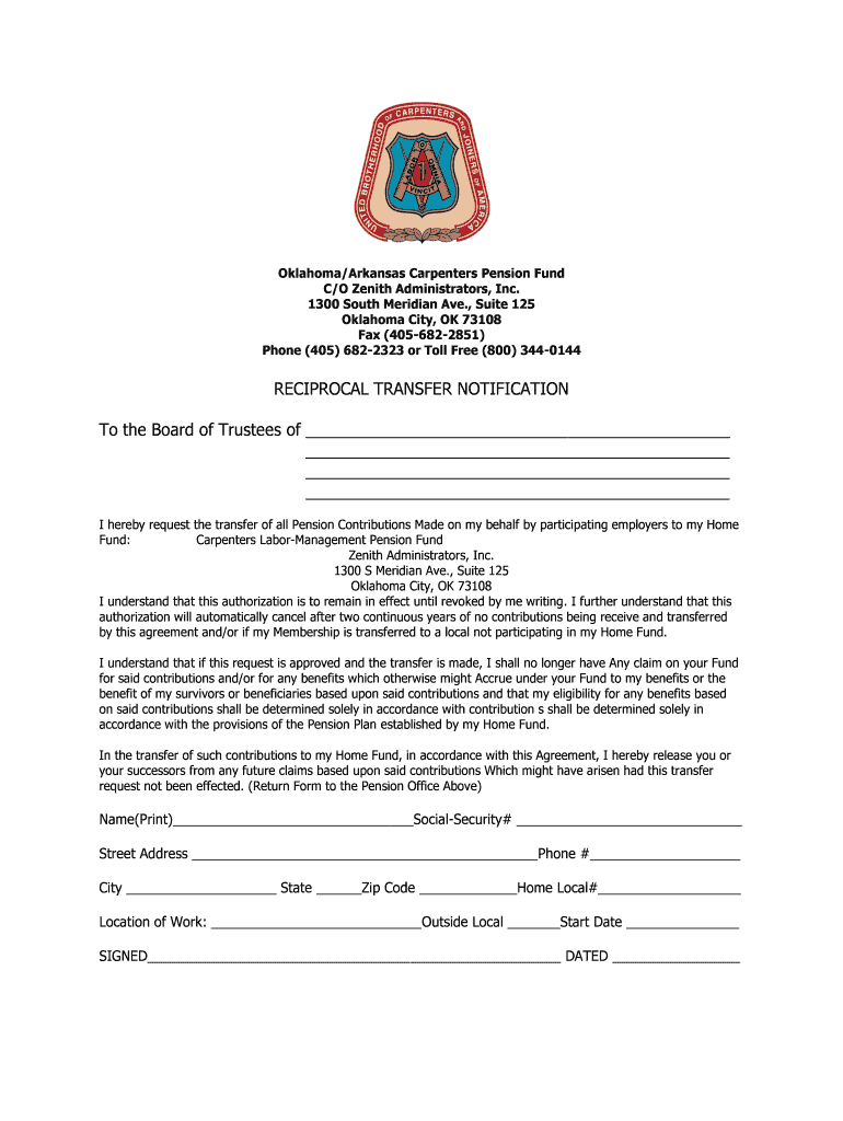 Oklahoma/Arkansas Carpenters Pension Fund C/O Zenith Administrators, Inc. 1300 South Meridian Ave., Suite 125 Oklahoma City, OK 73108 Fax (4056822851) Phone (405) 6822323 or Toll Free (800) 3440144RECIPROCAL