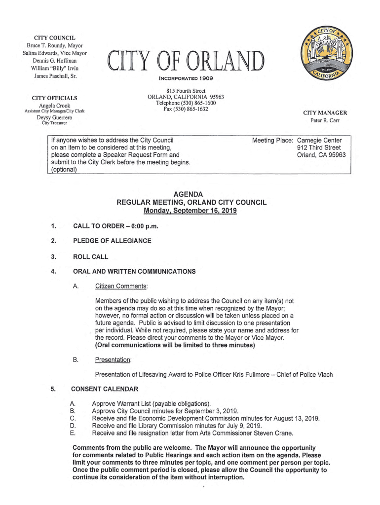 CITY COUNCIL Bruce T. Round, Mayor Salina Edwards, Vice Mayor Dennis G. Hoffman William Billy Irvin James Paschal, Sr. CITY OF ORA:U INCORPORATED1909815 Fourth Street ORLAND, CALIFORNIA 95963 Telephone