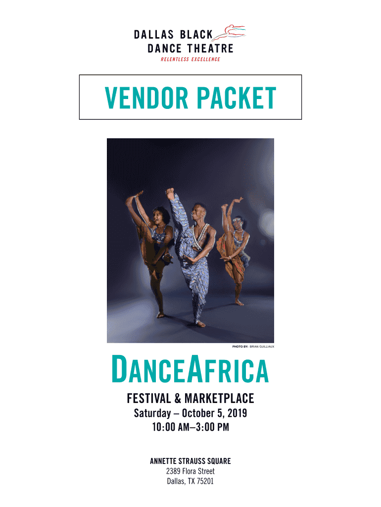VENDOR PACKETPHOTO BY: BRIAN GUILLIAUXFESTIVAL & MARKETPLACE Saturday, October 5, 2019 10:00 AM 3:00 PM ANNETTE STRAUSS SQUARE 2389 Flora Street Dallas, TX 75201DANCEAFRICA FESTIVAL & MARKETPLACE