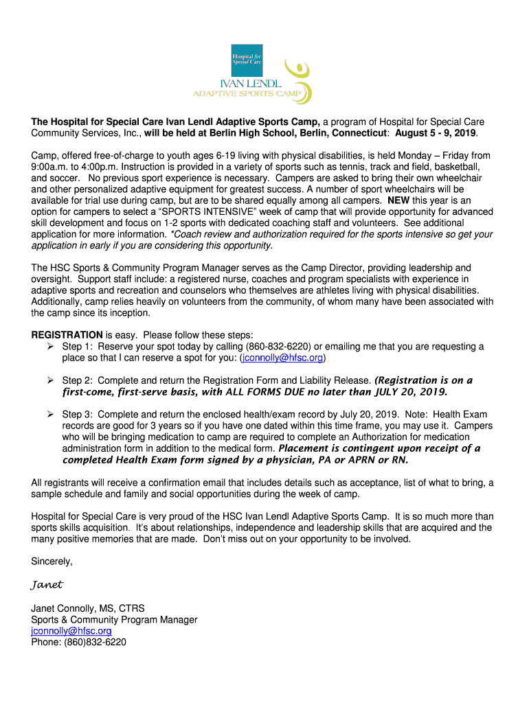 The Hospital for Special Care Ivan Lend Adaptive Sports Camp, a program of Hospital for Special Care Community Services, Inc., will be held at Berlin High School, Berlin, Connecticut: August 5 9,