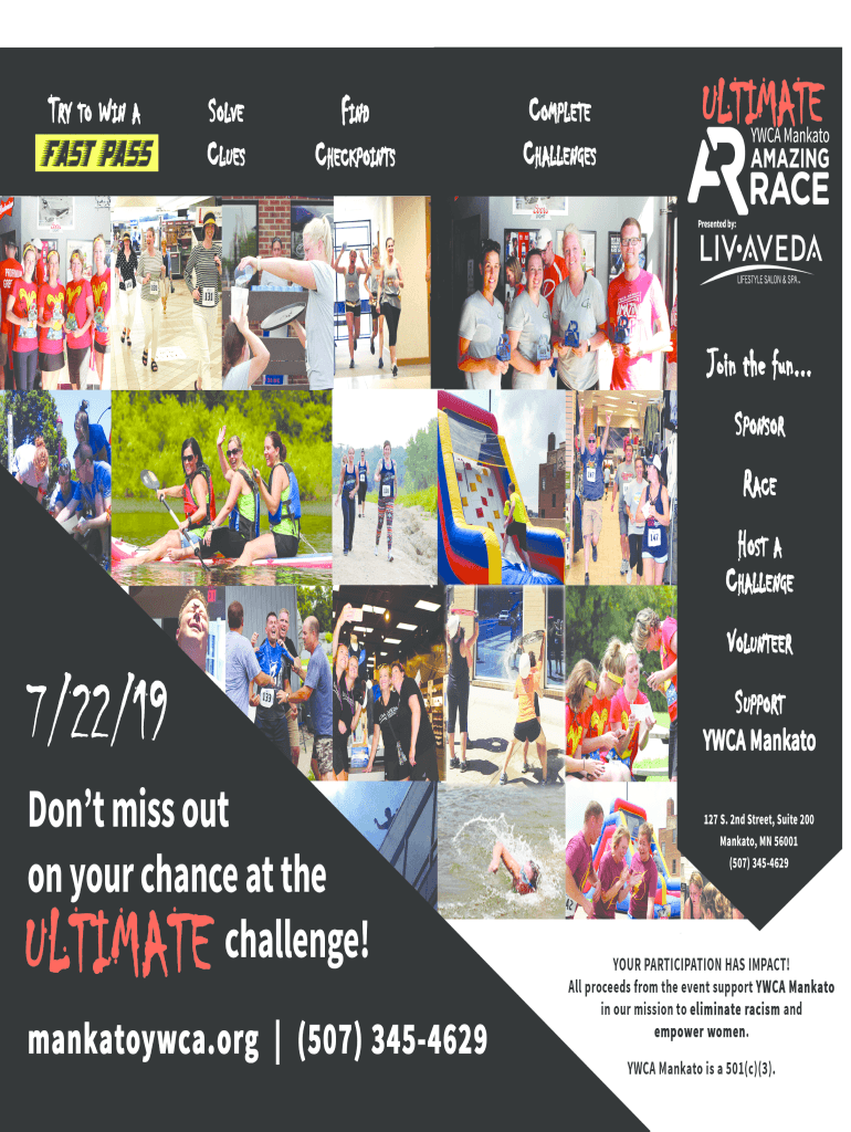 TEAM REGISTRATION OPTIONS YWCA Mankato is at it again challenging racers to solve clues, find checkpoints, and complete challenges!$750×400 / $500ULTIMATEADVENTURE SPONSOREarly bird until June 30