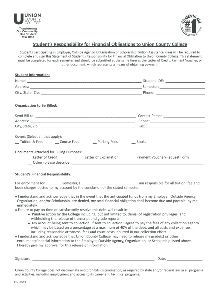 Students Responsibility for Financial Obligations to Union County CollegeStudents participating in Employer, Outside Agency, Organization or Scholarship Tuition Assistance Plans will be required to