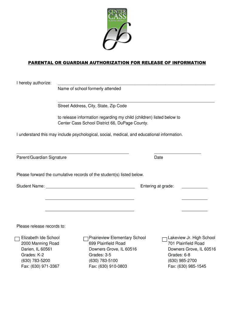 PARENTAL OR GUARDIAN AUTHORIZATION FOR RELEASE OF INFORMATION hereby authorize: Name of school formerly attended Street Address, City, State, Zip Code to release information regarding my child (children)