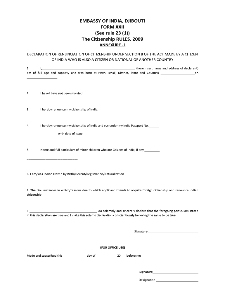 EMBASSY OF INDIA, DJIBOUTI FORM XXII (See rule 23 (1)) The Citizenship RULES, 2009 Appendix I DECLARATION OF RENUNCIATION OF CITIZENSHIP UNDER SECTION 8 OF THE ACT MADE BY A CITIZEN OF INDIA WHO IS