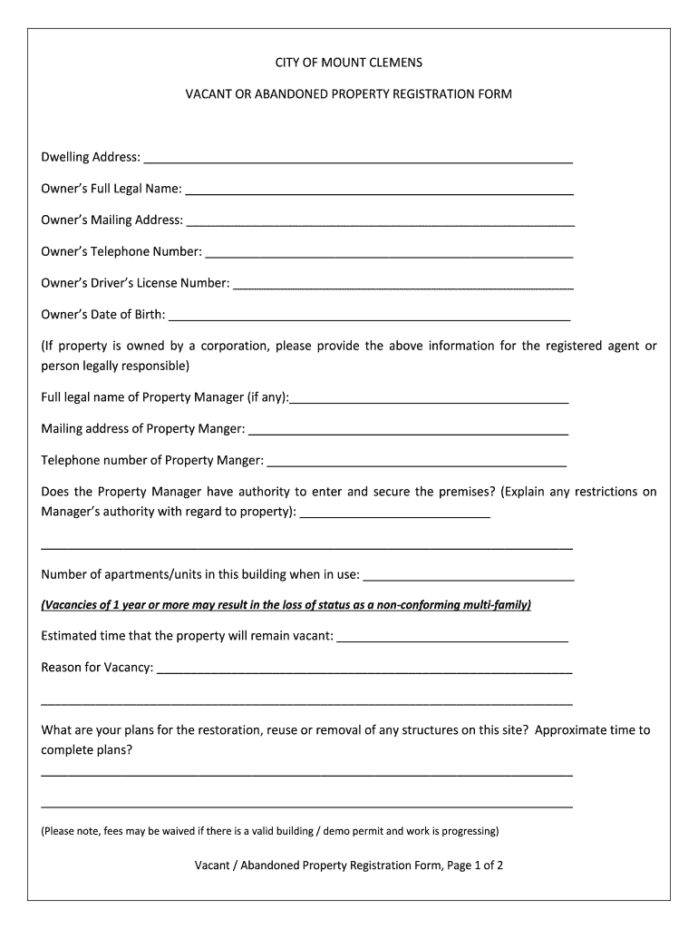 CITY OF MOUNT CLEMENS VACANT OR ABANDONED PROPERTY REGISTRATION Foretelling Address: Owners Full Legal Name: Owners Mailing Address: Owners Telephone Number: Owners Driver's License Number: Owners