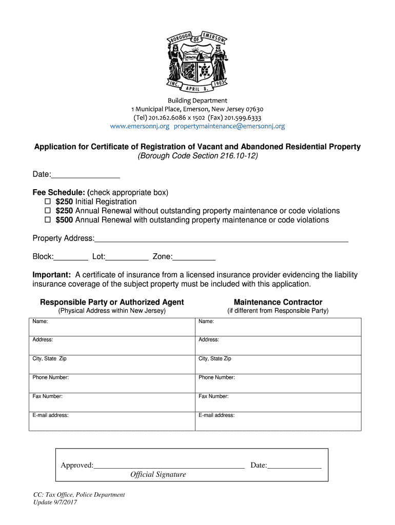 Building Department 1 Municipal Place, Emerson, New Jersey 07630 (Tel) 201.262.6086 × 1502 (Fax) 201.599.6333 www.emersonnj.org property maintenance Emerson. Reapplication for Certificate of Registration