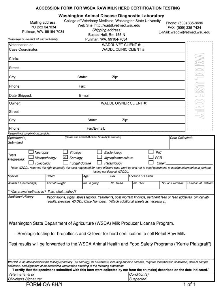 ACCESSION FORM FOR USDA RAW MILK HERD CERTIFICATION TESTING Washington Animal Disease Diagnostic LaboratoryCollege of Veterinary Medicine, Washington State University