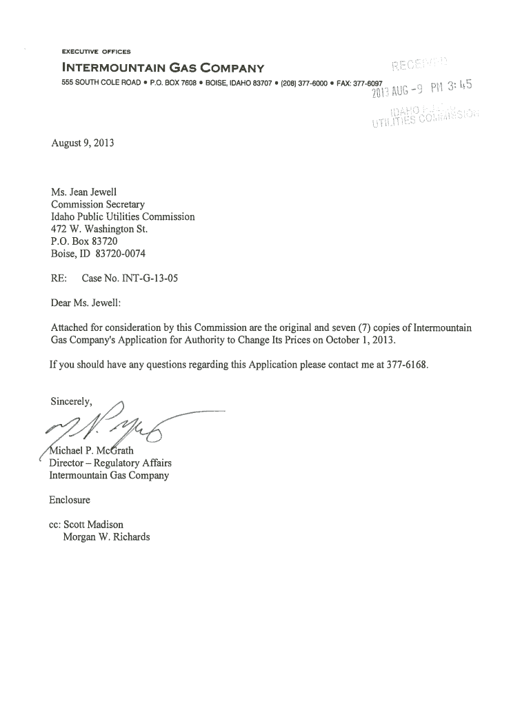 EXECUTIVE OFFICEScINTERMOUNTAIN GAS COMPANY 555 SOUTH COLE ROAD P.O. BOX 7608 BOISE, IDAHO 83707 (208) 3776000 FAX: 37760972U,,,.!b)riots August 9, 2013Ms. Jean Jewel! Commission Secretary Idaho Public