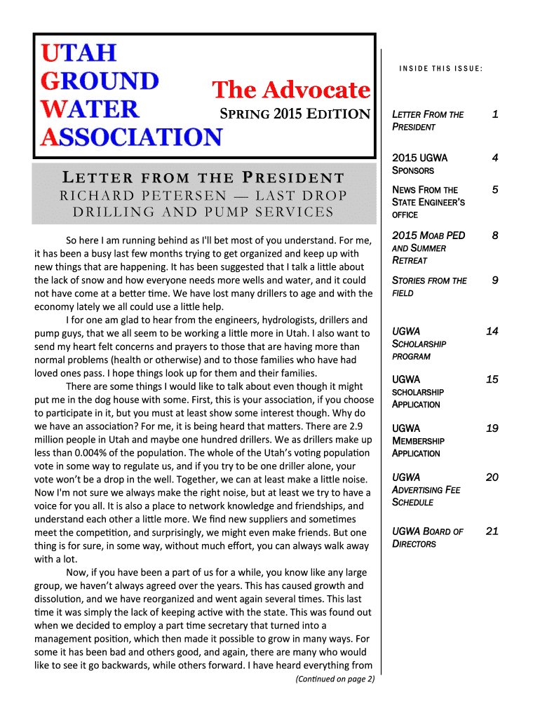 INSIDE THIS ISSUE:The Advocate SPRING 2015 EDITIONLETTERFROM THE PRESIDENT RICHARD PETERSEN LAST DROP D R I L L I N G A N D P U M P S E RV I C E S So here I am running behind as I'll bet most of you