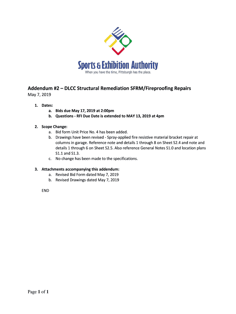 Addendum #2 DCC Structural Remediation SFR/Fireproofing Repairs May 7, 2019 1. Dates: a. Bids due May 17, 2019, at 2:00pm b. Questions RFI Due Date is extended to MAY 13, 2019, at 4pm 2. Scope Change: