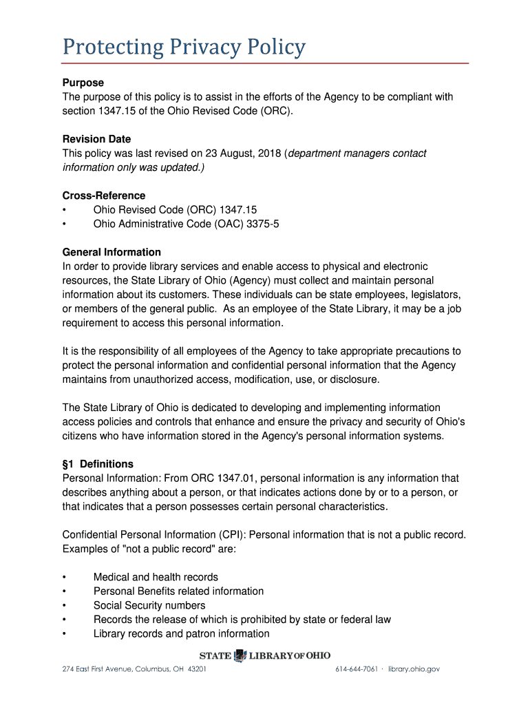 Protecting Privacy Policy Purpose The purpose of this policy is to assist in the efforts of the Agency to be compliant with section 1347.15 of the Ohio Revised Code (ORC). Revision Date This policy