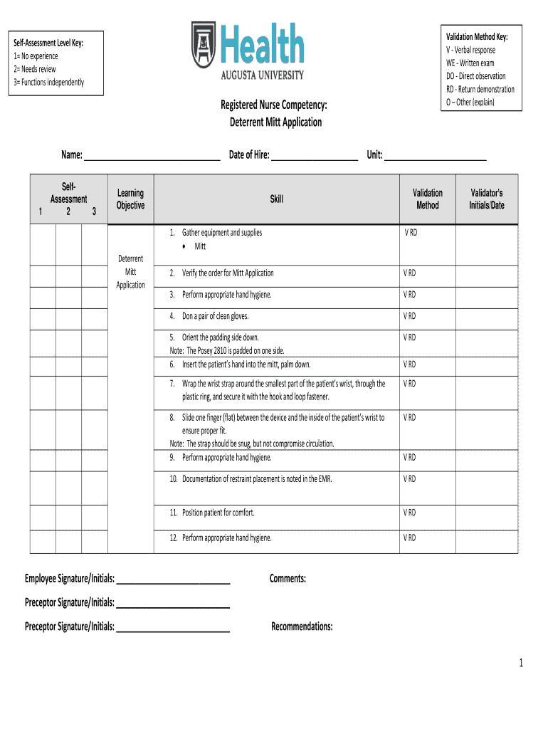 Validation Method Key: V Verbal response WE Have Written exam DO Direct observation RD Return demonstration O Other (explain)Reassessment Level Key: 1 No experience 2 Needs review 3 Functions independentlyRegistered