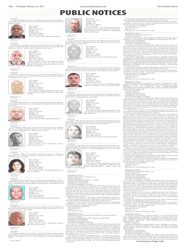 10B Thursday, February 23, 2017The Wichita Citizens.ouachitacitizen.nonpublic NOTICES NOTICE I, Anthony Willis, have been convicted of 2 Counts Sexual Battery in Fourth Judicial District Court, Wichita