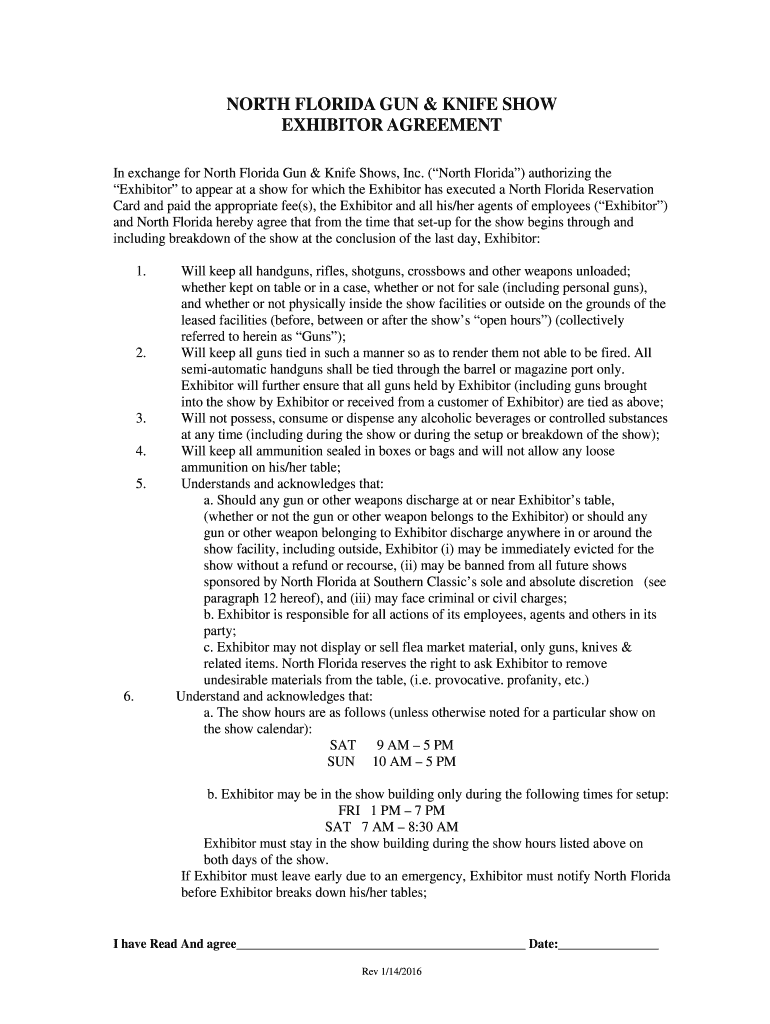 NORTH FLORIDA GUN & KNIFE SHOW EXHIBITOR AGREEMENT In exchange for North Florida Gun & Knife Shows, Inc. (North Florida) authorizing the Exhibitor to appear at a show for which the Exhibitor has executed