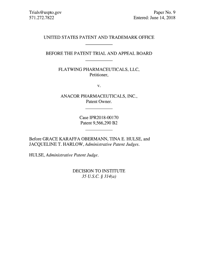 Trials USPTO.gov 571.272.7822Paper No. 9 Entered: June 14, 2018UNITED STATES PATENT AND TRADEMARK OFFICE BEFORE THE PATENT TRIAL AND APPEAL BOARD FLATTING PHARMACEUTICALS, LLC, Petitioner, v. ANCHOR