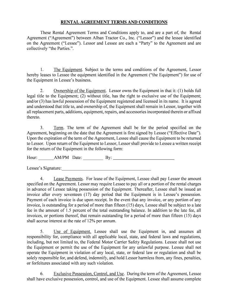 Agreement (Agreement) between Alan Tractor Co., Inc. (Lessor) and the lessee